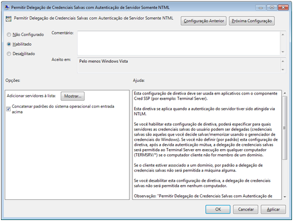 No painel direito, clique duas vezes em Permitir Credenciais Salvas com Autenticação de Servidor Somente NTML.