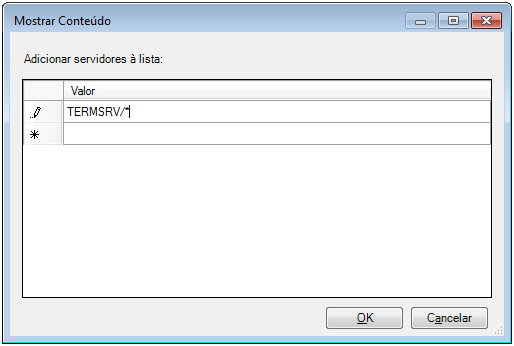 Na caixa de diálogo Mostrar Conteúdo, clique em Adicionar, digite o nome do computador remoto (servidor) neste formato: TERMSRV/* e, em seguida, clique em OK.